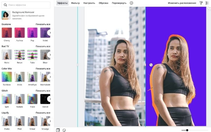 • Canva Background Remover — встроенная функция в Canva Pro, которая также позволяет заменить фон на любой другой.