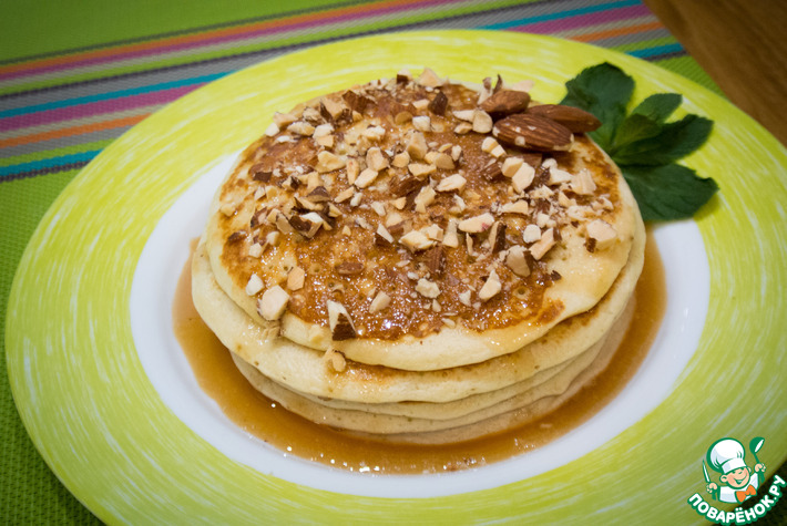 - Одесские панкейки подают с солёной карамелью и орехами.