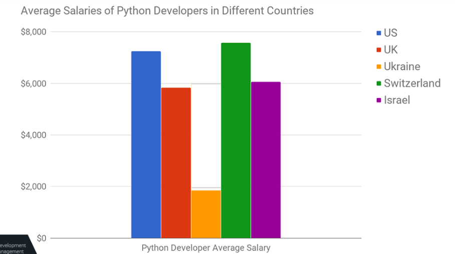 Навіть віддалена співпраця з закордонними компаніями може суттєво збільшити рівень доходу. Наприклад, згідно з платформою Glassdoor, середня зарплата Python-розробника у США становить близько 9000 доларів на місяць, у Канаді — приблизно 7000 доларів, а у країнах ЄС — 5000–8000 доларів.